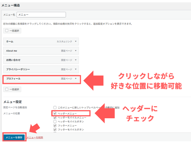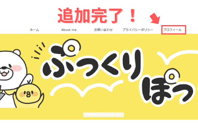 これで、ブログの上部メニューからすぐにプロフィールページにアクセスできます。