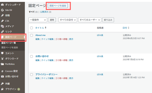 1.WordPress管理画面の「固定ページ」→「新規追加」をクリック